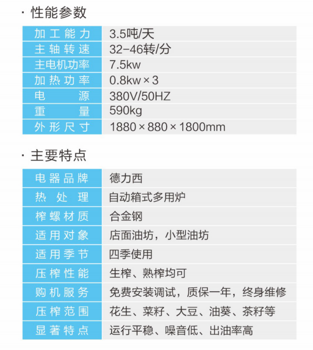 ★壓榨范圍:花生、大豆、菜籽、油葵、茶籽、芝麻等;★適用對(duì)象:店面油坊和微小油坊;★壓榨性能:熱榨一次榨盡,免費(fèi)安裝調(diào)試